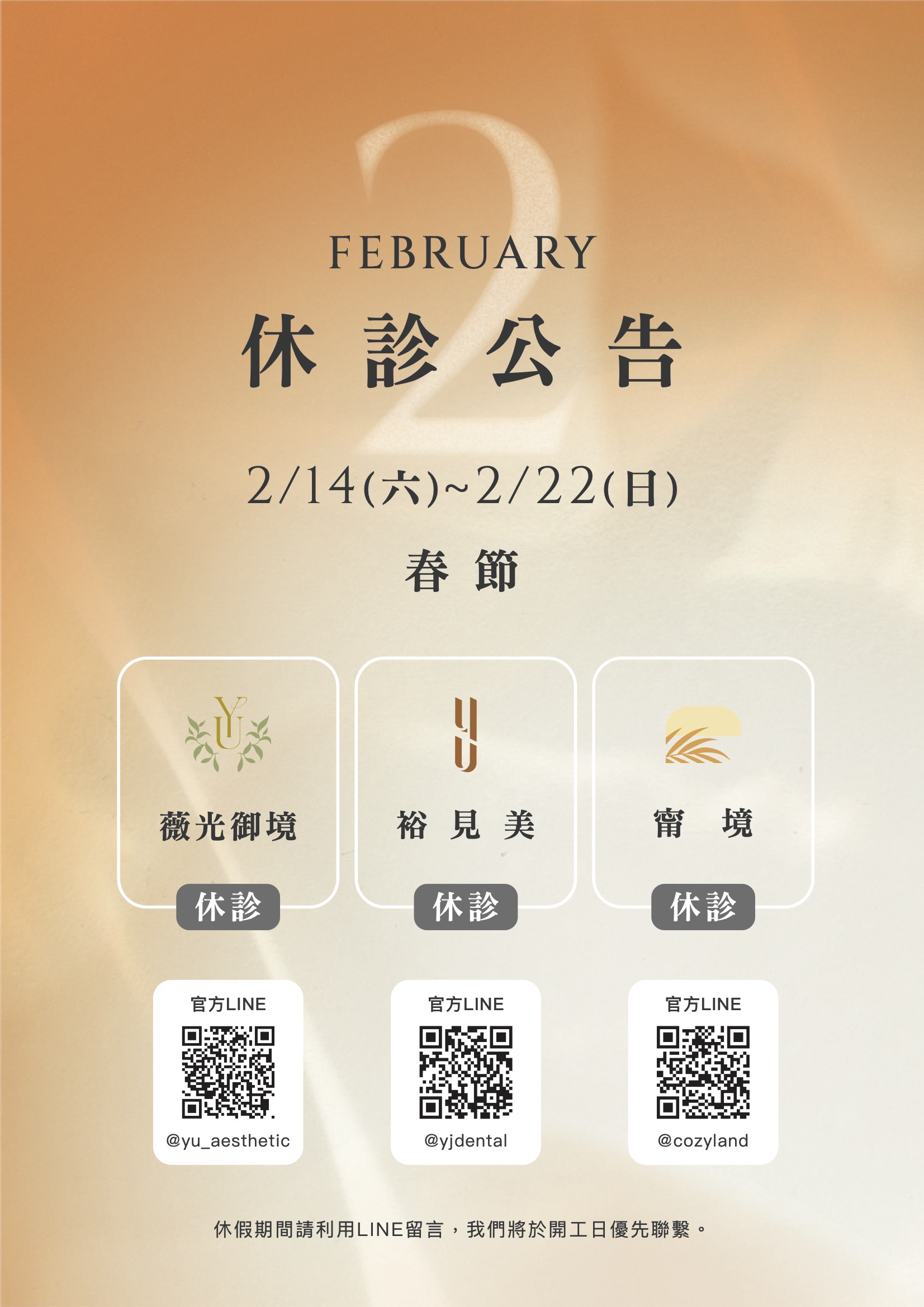 「 2/14(六)~ 2/22(日)暫停門診服務,並於 2/23(一)恢復正常看診」